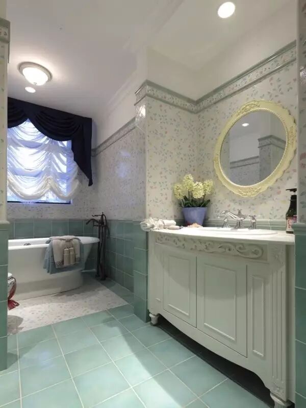 适合类型:适合于欧式风格和乡村风格,铺贴方式更丰富。通常可以用颜色略深于所铺主体瓷砖的大理石或瓷砖,在地面四周围以15厘米左右的围边,铺贴效果让人感觉用材更加精致,而且更能烘托出空间气氛。